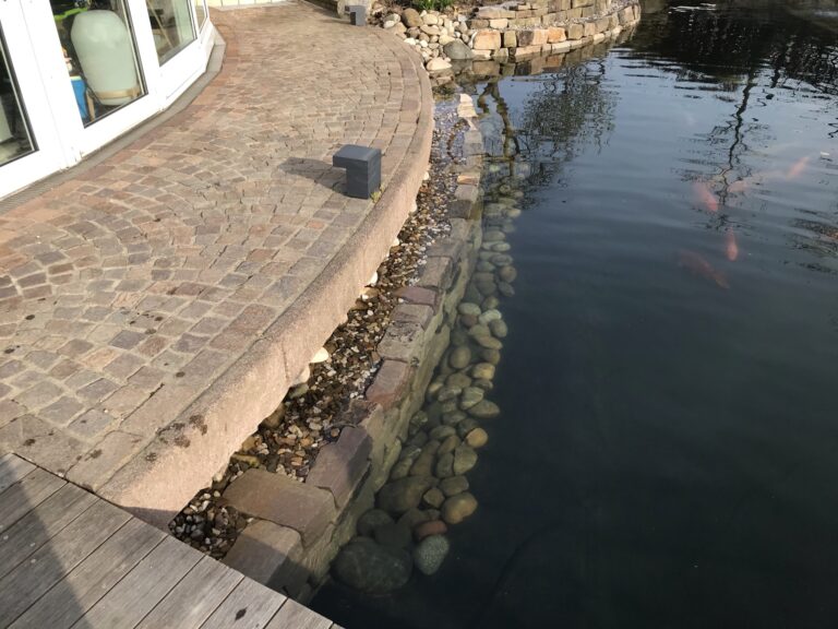 An Stellen mit starker Strömung oder dort, wo Schifffahrt für Wellenschlag sorgt, reicht Grün allein oft nicht aus. Hier kommen Wasserbausteine aus Hartgestein wie Basalt oder Granit zum Einsatz. Wir schichten diese Steine so auf, dass sie die Energie des Wassers brechen, aber trotzdem noch kleine Hohlräume für Wasserorganismen lassen. Wichtig ist dabei das Filtervlies unter den Steinen: Es verhindert, dass das feine Bodenmaterial durch die Steinfugen ins Wasser gespült wird – das ist die häufigste Ursache für plötzliche Absackungen hinter der Uferlinie.